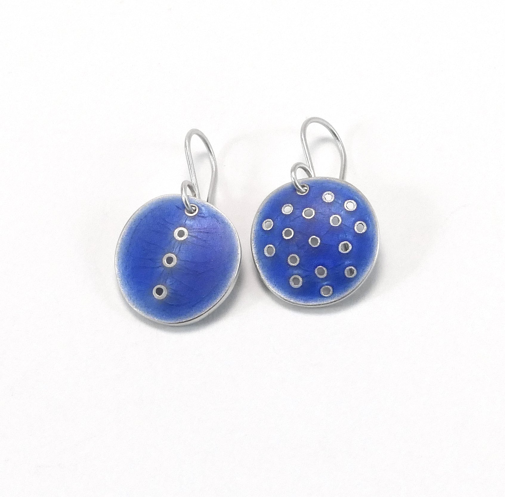 These unique hand-made earrings are made from sterling silver and vitreous enamel that has been fired onto the silver in a hot kiln