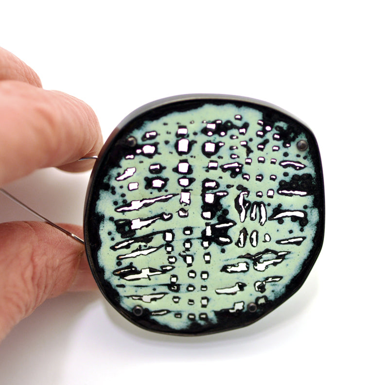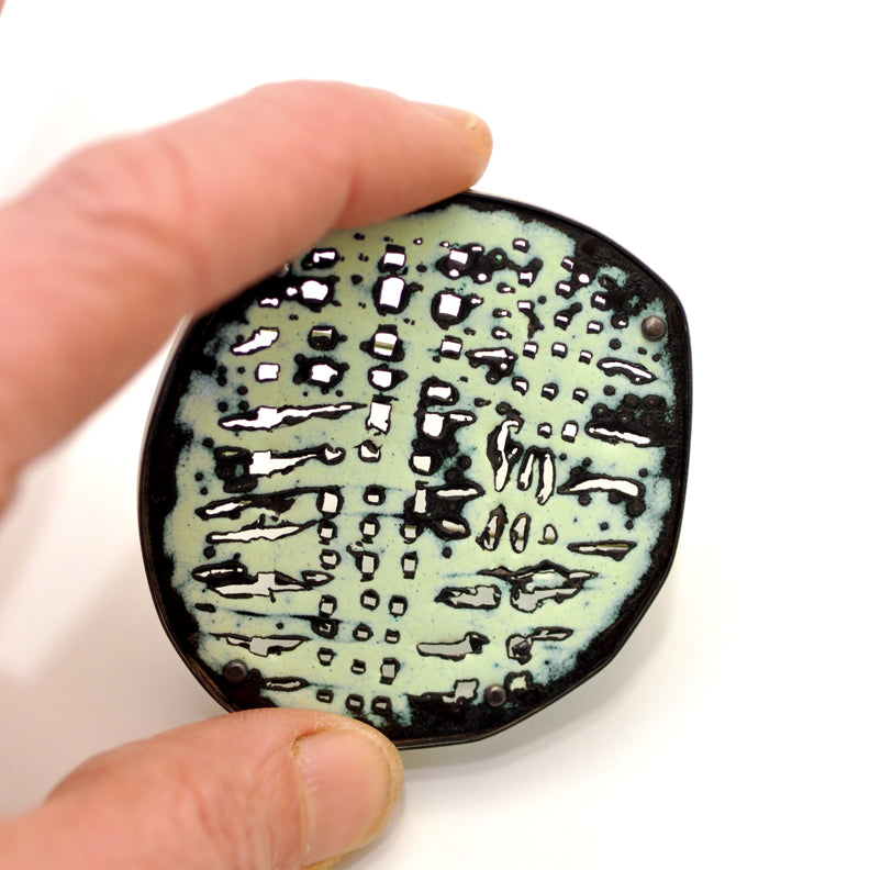 This Perforated pistachio coloured brooch is made from vitreous enamel fired onto a delicate piece of copper sheet. The surround is made from oxidised silver sheet, and silver rivets hold everything in place.