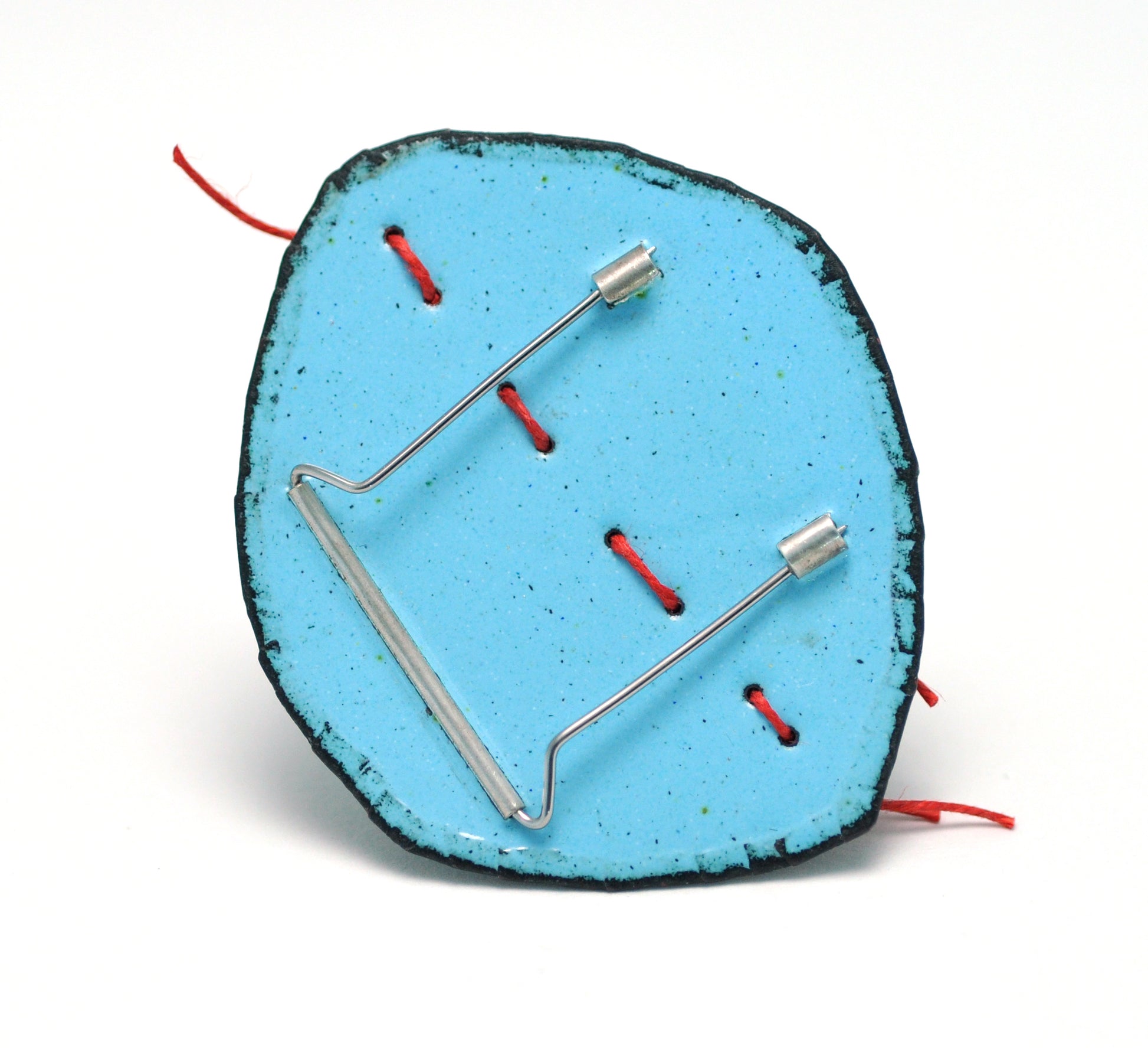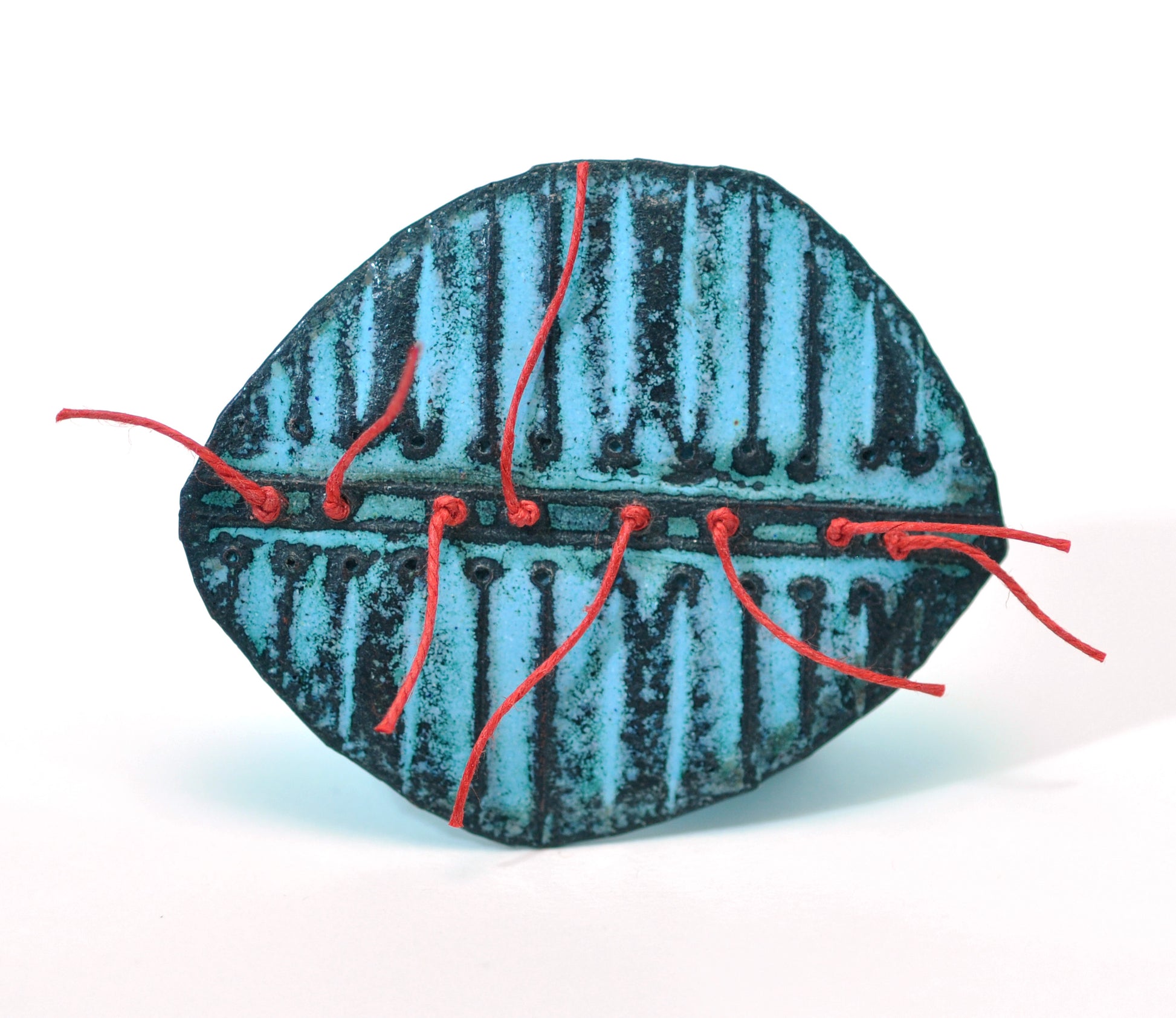 This Powder Blue Vitreous Enamel brooch has Red Linen Thread stitched and knotted through it.